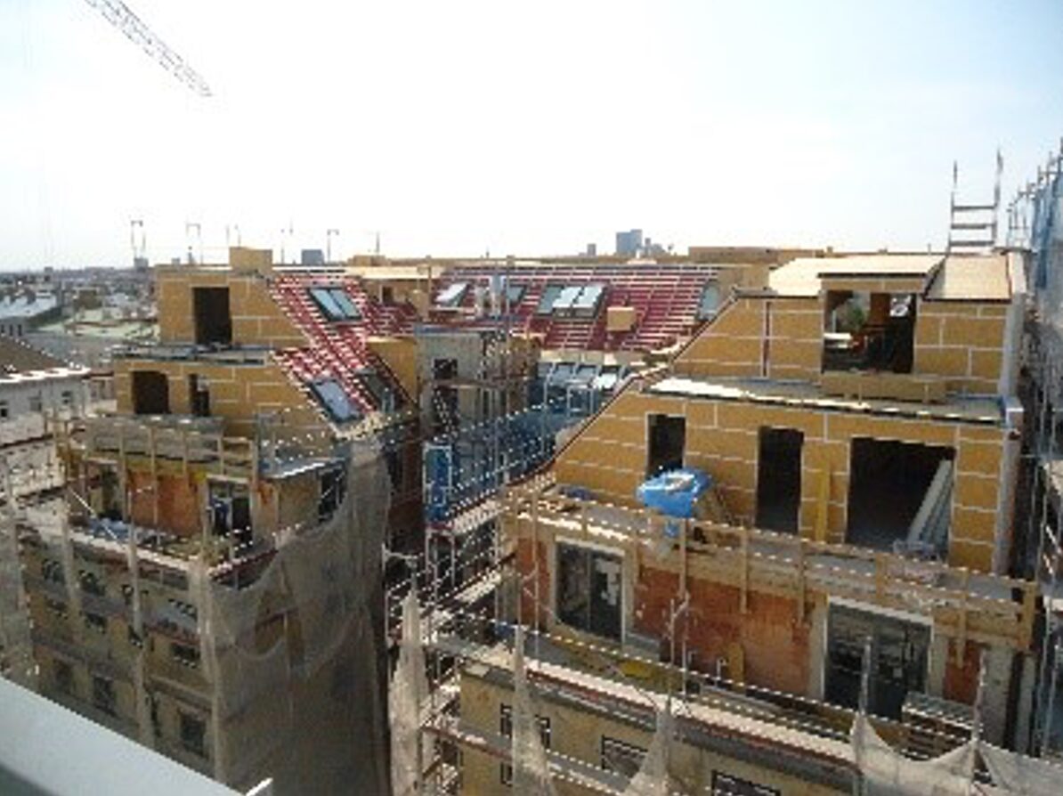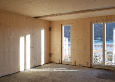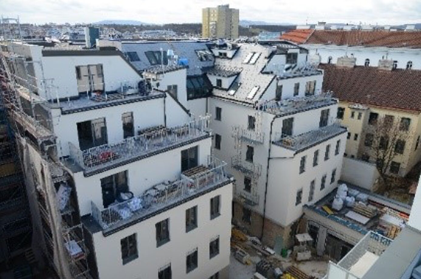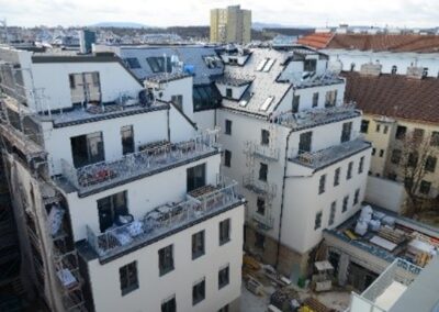 Die Herausforderung bei diesem Projekt lag, neben der deutlichen Senkung der Energiebedarfswerte, in der Lösung der Dachausbauten und der dreigeschoßigen Aufstockung in Massivholzbauweise auf den gründerzeitlichen Bestandsgebäuden.