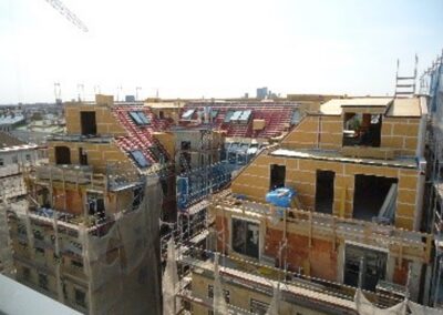 Projektumfang | Generalsanierung und wärmetechnische Ertüchtigung von vier gründerzeitlichen Wohngebäuden mit Dachgeschoßausbau und in einem Fall einer dreigeschoßigen Aufstockung in Massivholzbauweise Generalsanierung von 3.900 m² Nutzfläche zuzüglich Dachgeschoßausbau mit 2.300 m² Nutzfläche zuzüglich Aufstockung mit 2.900 m² Nutzfläche |